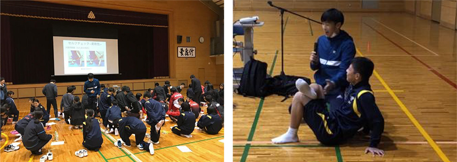 わかりやすく伝わるよう項目を、『スポーツ傷害と障害の違い』『成長期の身体の特徴』『セルフチェック』『セルフケア』の4つに分けて話をしました。